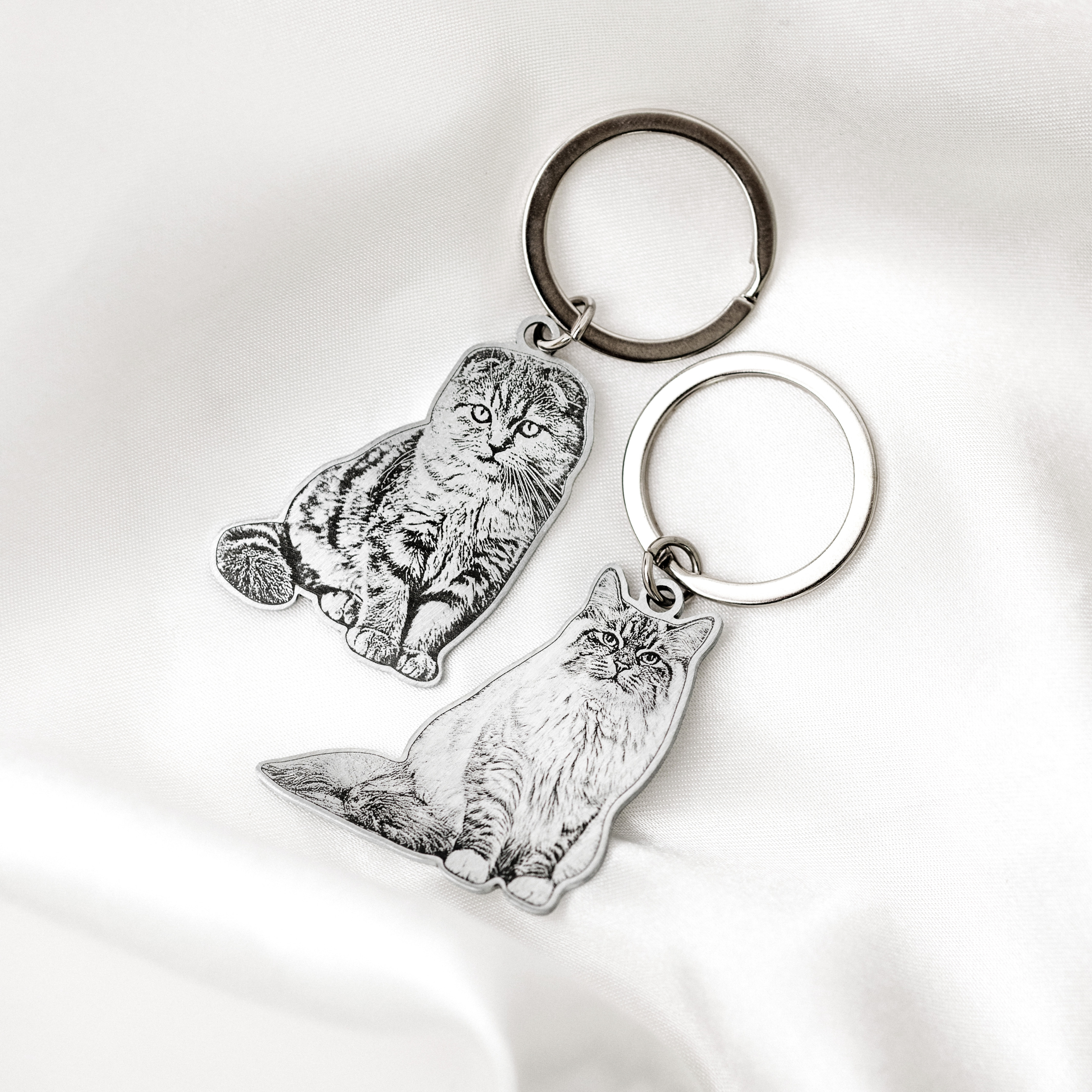 Want to feature all your furballs on one keychain? Make sure they’re cozy and close in the photo. But for extra attention to detail (and less cattitude), consider getting a keychain for each kitty!