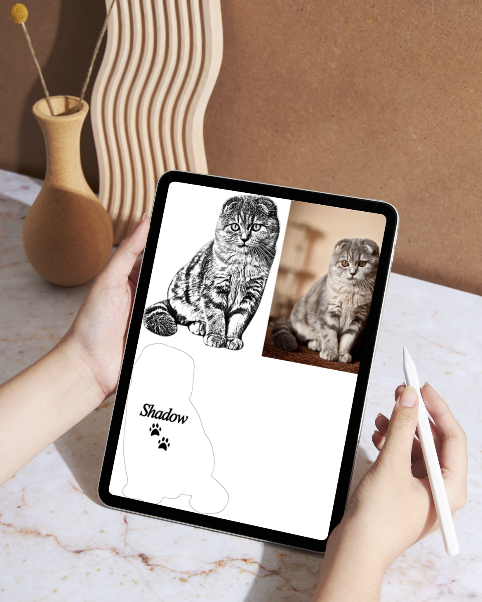 As soon as we receive your order with photo, our team begins the creative process by transferring your pet’s photo into a production mockup. This step takes about 1-2 business days and ensures that every detail of your pet’s likeness is captured perfectly for engraving.